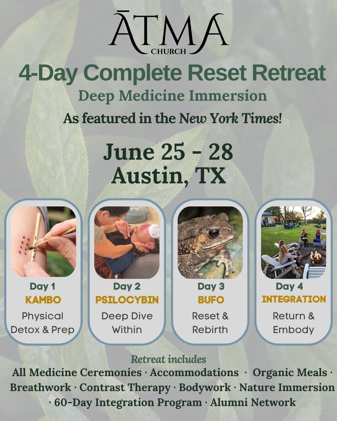 Our transformative 4-day entheogenic retreat offers a rare opportunity to explore the healing power of Kambo, Sananga, Psilocybin, and Bufo in a safe and supportive setting. Guided by experienced facilitators, you’ll journey deep within, releasing emotional and physical blockages while reconnecting with your true self.